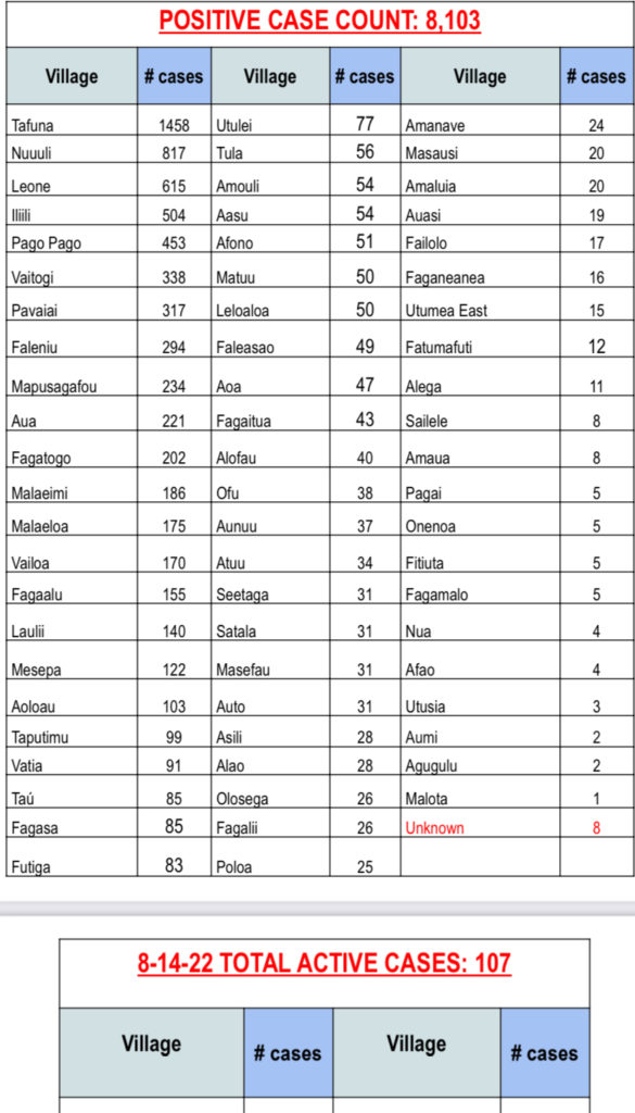 Of the active positive cases, numbers have dropped considerably. Tafuna at the top has 30, the only village with double digits while Covid cases in the rest of the villages are single digit.